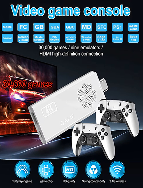 1. 4K HD Game Stick: HDMI გამომავალი, შეიძლება ტელევიზორთან/მონიტორთან/პროექტორთან დაკავშირება, plug and play.